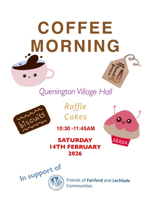 Please support the Quenington Coffee Morning to be held on Saturday 14th February 10.30 – 1145 at Quenington Village Hall. They are going to donate to our Charity – Friends of Fairford and Lechlade Communities. Thank you to all involved.
